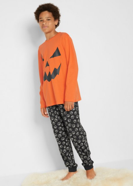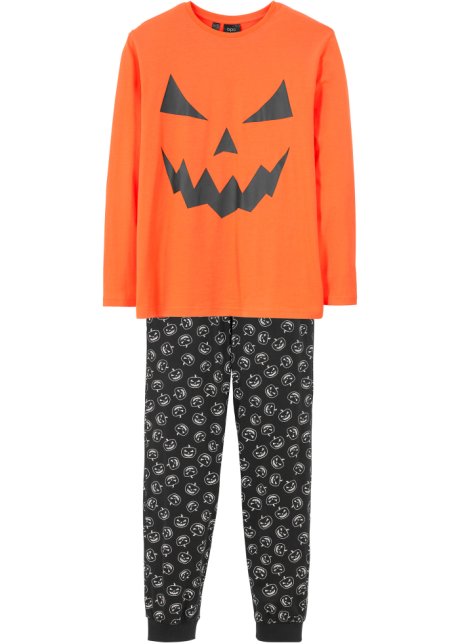 These pajamas consist of long trousers and a longsleeve. The pants are characterized by the pumpkin motif in allover of -print and the wide hems. The top is a special eye-catcher thanks to the XL pumpkin print that matches the trousers. An absolute must-have for cool kids during the scary Halloween season!
