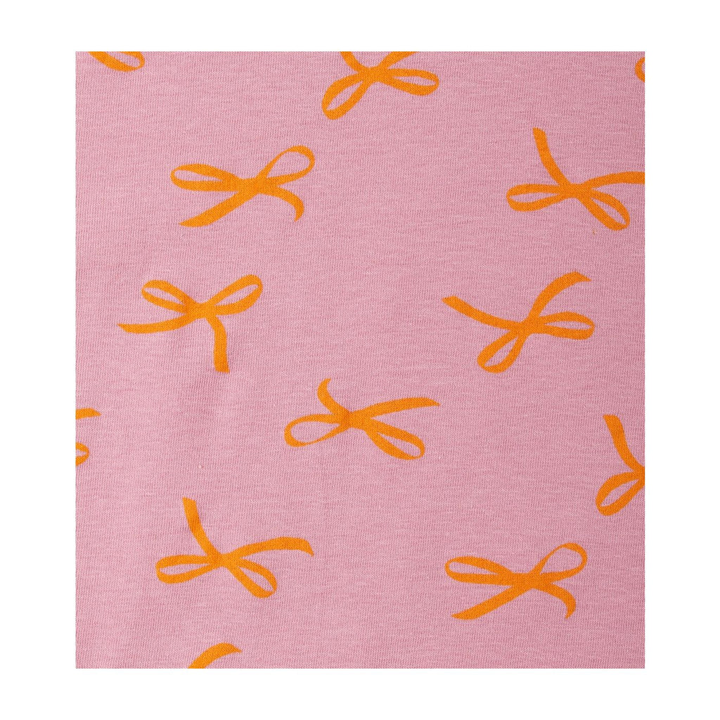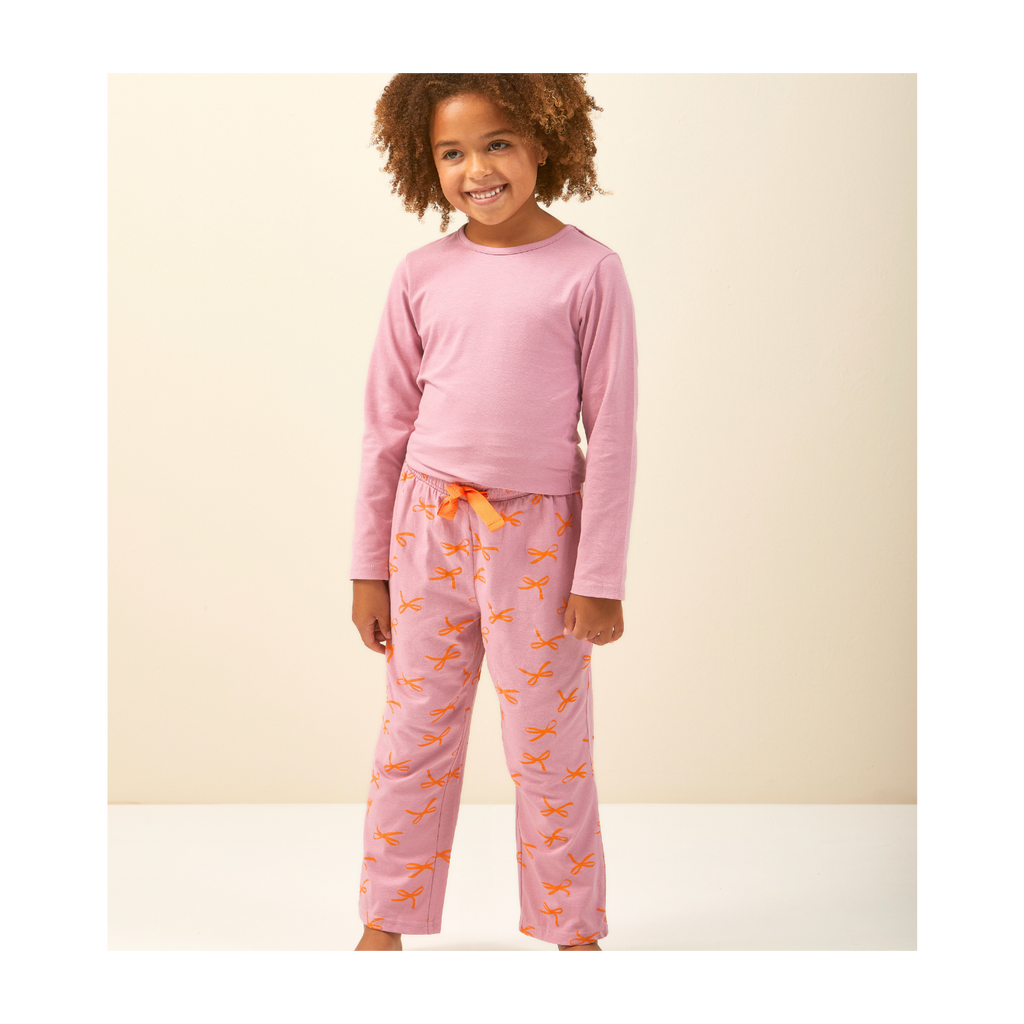 Pink pyjama set for girls made of comfy soft sustainable cotton. These pyjamas consist of a long sleeved pink T-shirt and long comfy pyjama trousers with a cool all-over-bows-print. The trousers have a soft elasticated waistband with an orange cord. Fabric: 95% organic cotton (GOTS), 5% elasthan