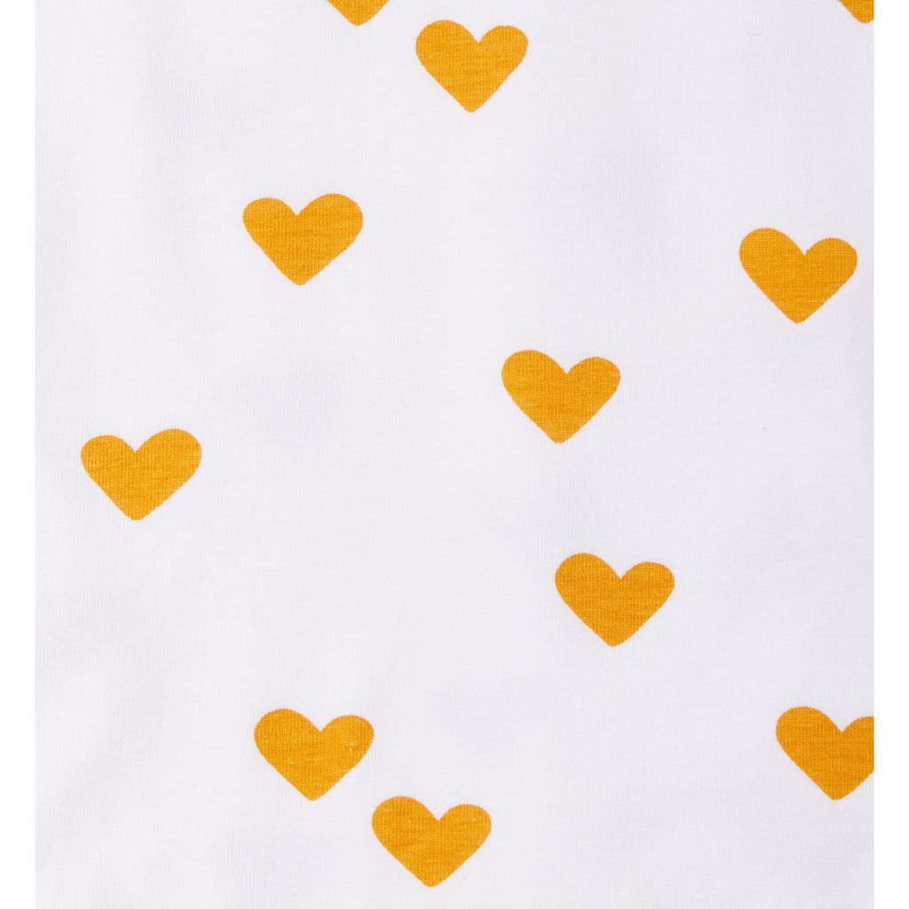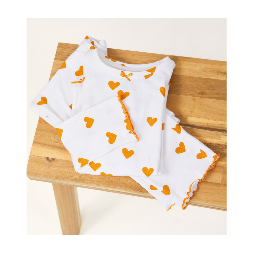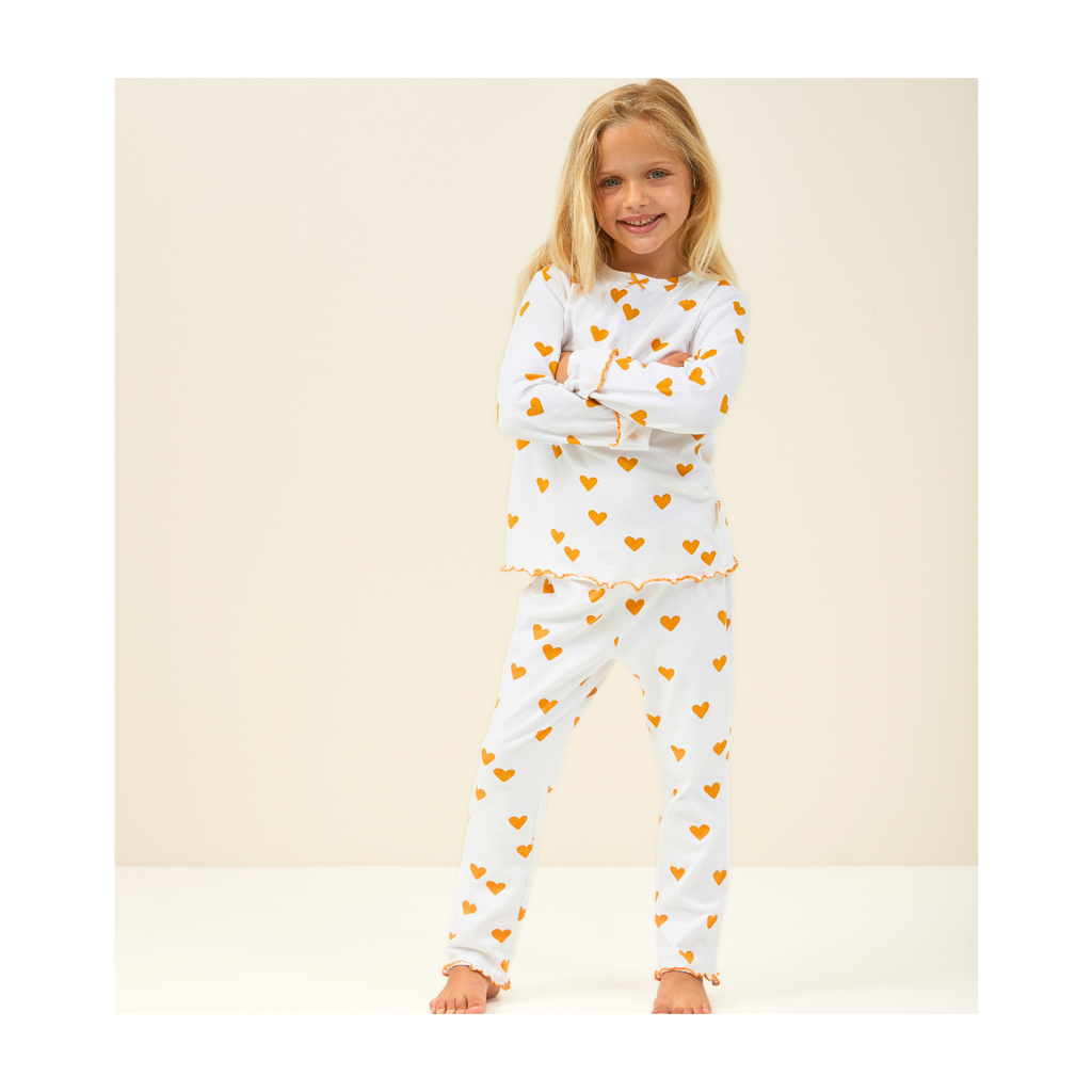 Lovely white girls PJs in a great all-over-hearts-print. Two piece pyjamas set consists of a T-shirt with long sleeves and slim fit pyjamas trousers. The hem of the shirt and the bottom of the trouser legs are finished with beautiful contrast stitching. Fabric: 95% organic cotton (GOTS), 5% elasthan.