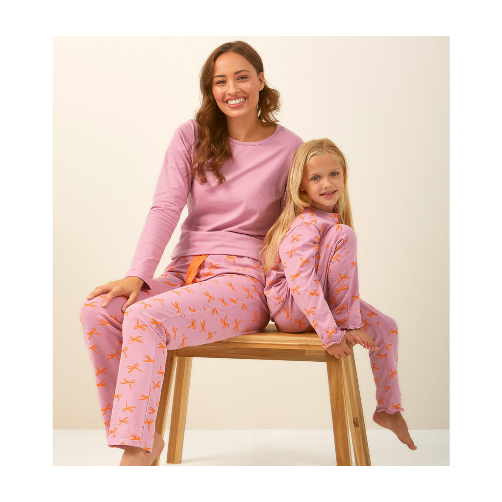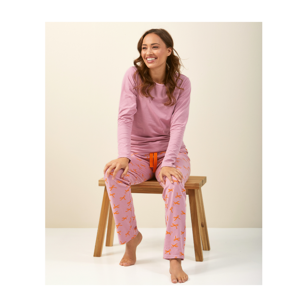 Fancy pink pyjama set for women made of comfy soft sustainable cotton. These pyjamas consist of a long sleeved T-shirt in pink and long pyjama trousers with a bows-print. The long trousers have a soft elasticated waistband with an adjustable cord.