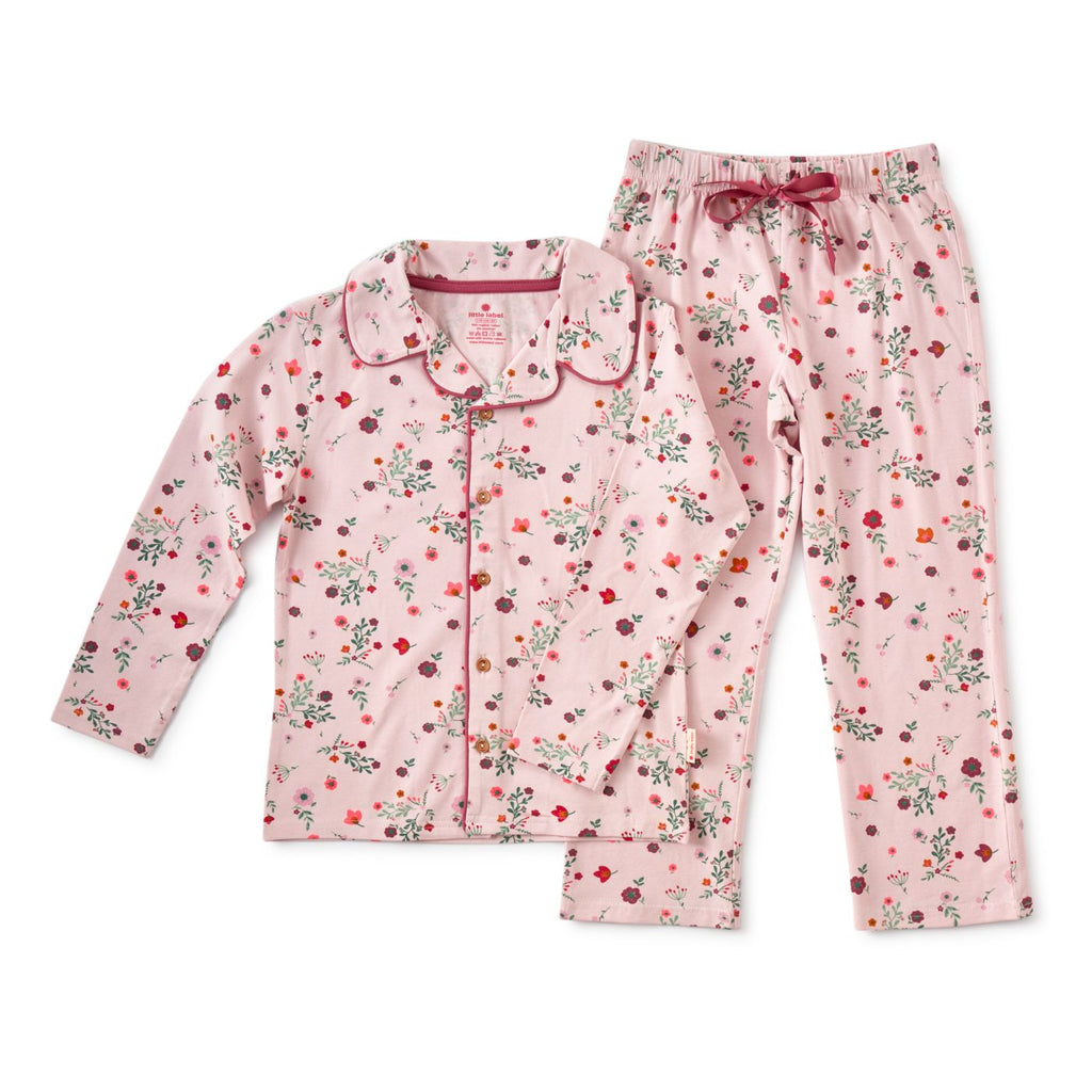 Great lilac pink pyjama set for girls in granddad style in lovely all-over-flowers-print. Both the tee and the pyjama trousers are made of soft woven cotton. The trousers have a comfy elasticated waistband. Fabric: 95% sustainable cotton, 5% elastane.